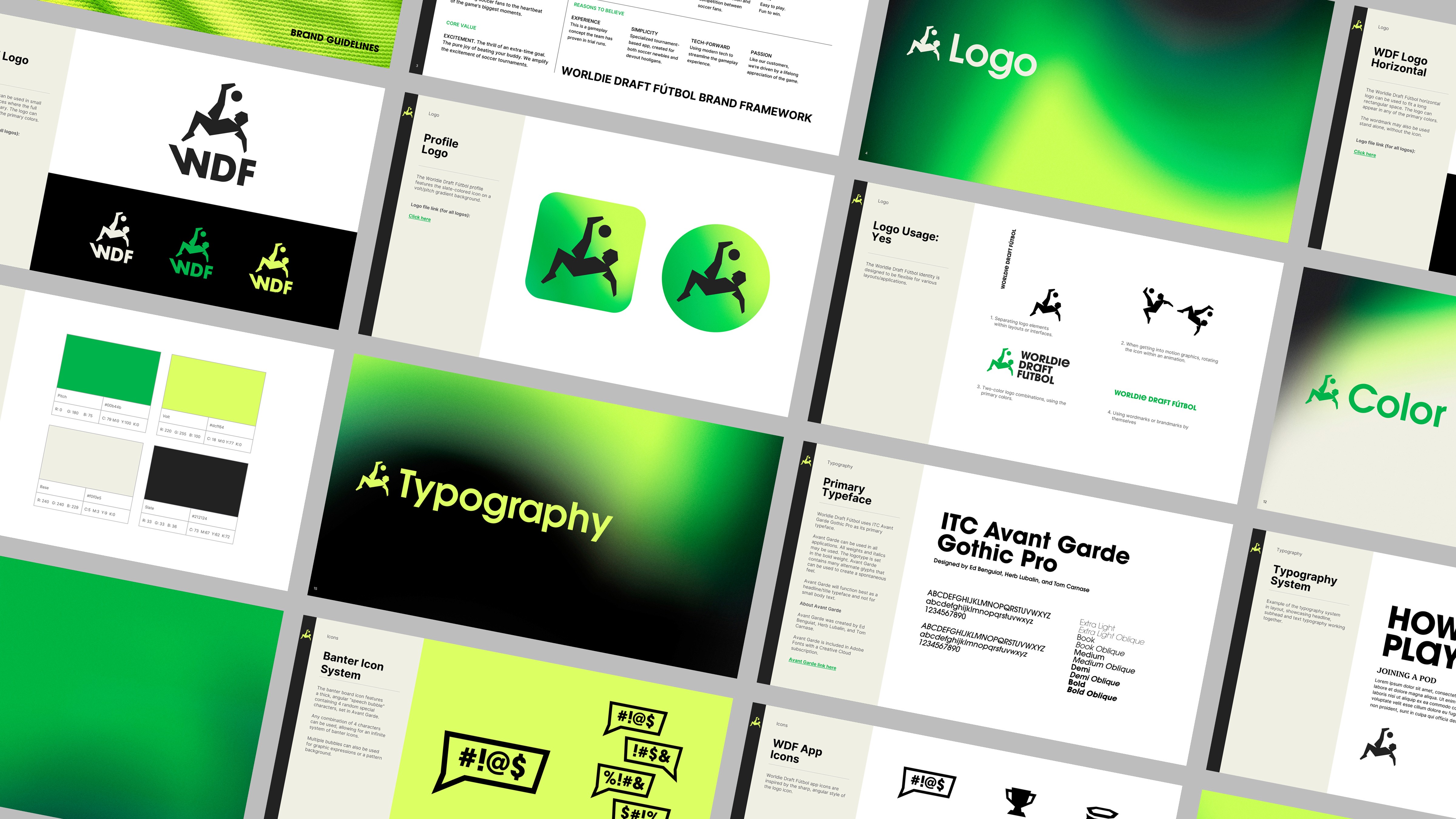 The Worldie Draft Futbol logo is built around a bicycle kick. Playful typography and energetic color palette work alongside the logo, creating a fun vibe. Brand guidelines paved the way for a seamless app design experience.